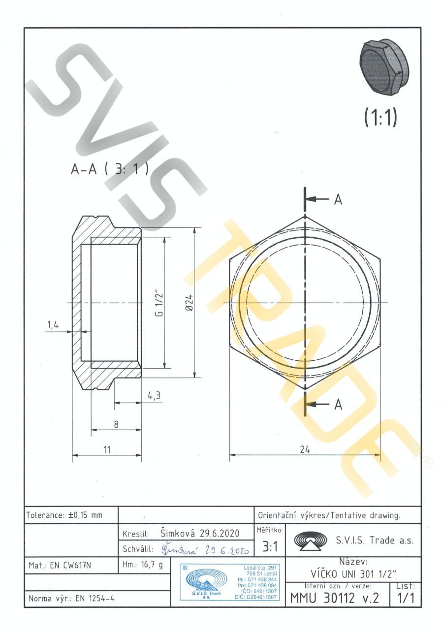 Tvarovka z mosadze CW617N. Určená pre spájanie so závitom ISO 228-1. Prevedenie: bez povrchovej úpravy.
