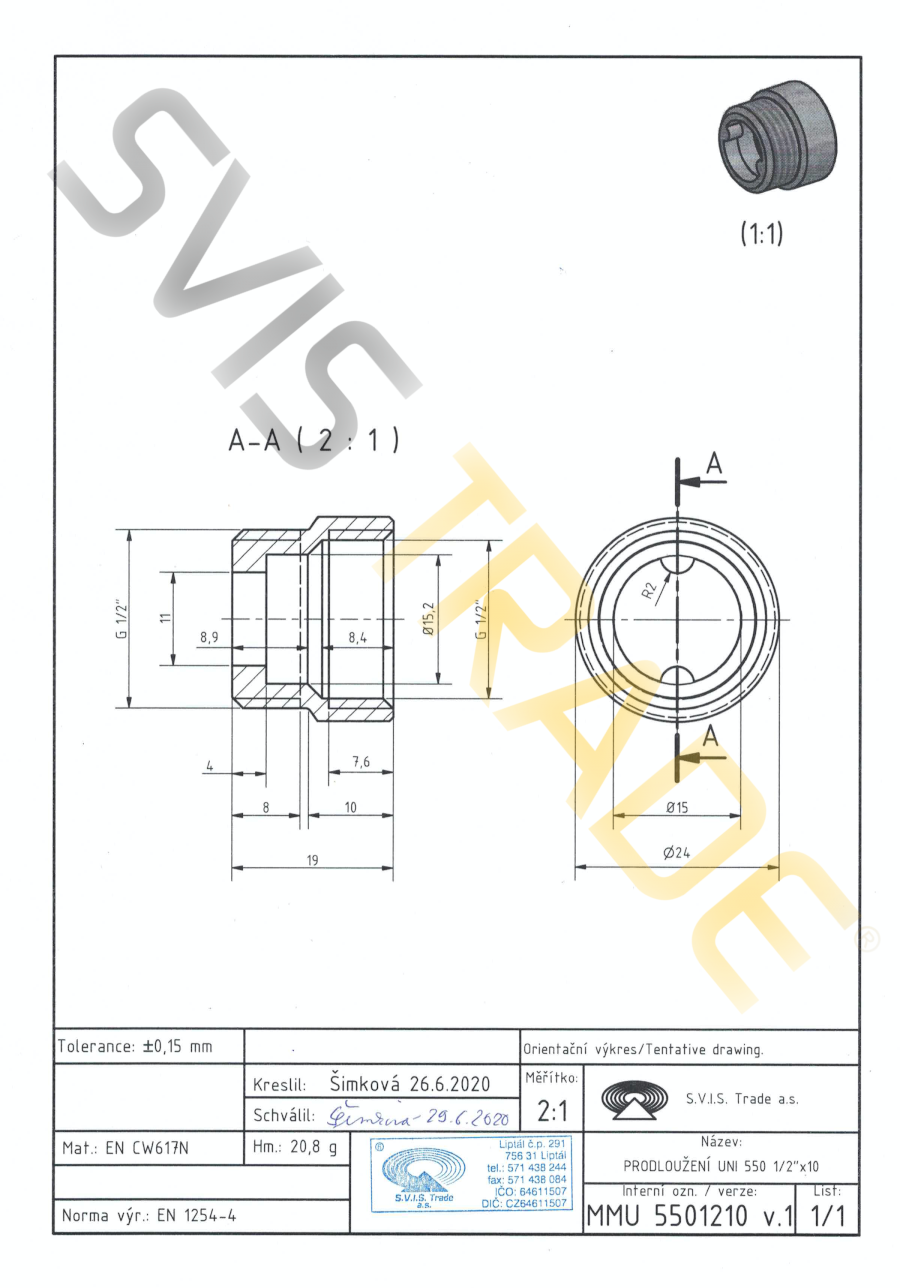 Tvarovka z mosadze CW617N. Určená pre spájanie so závitom ISO 228-1. Prevedenie: bez povrchovej úpravy.