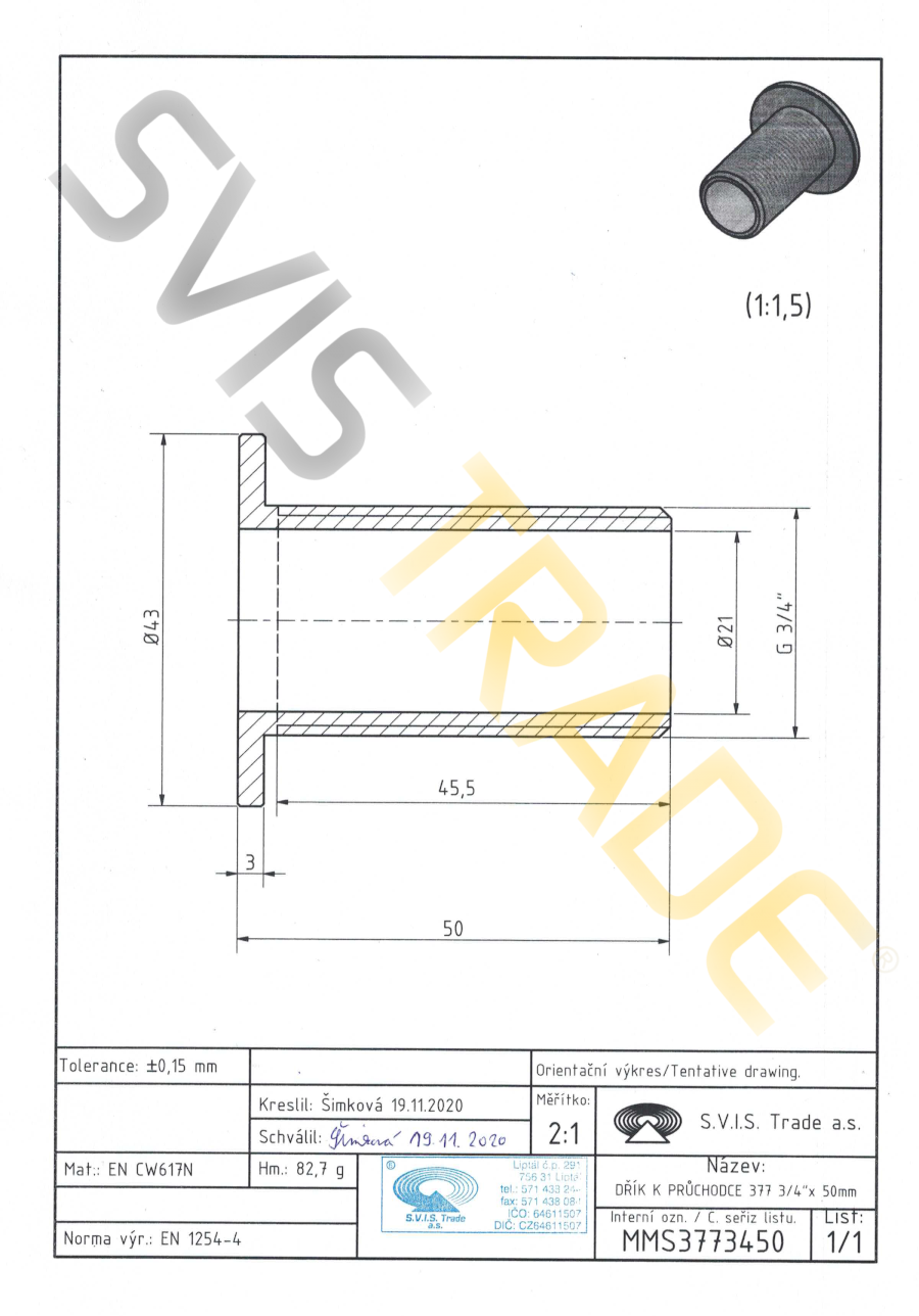 Mosazná průchodka k nádrži - díl dřík M – 377 MMS - STANDARD. Vyrobeno dle EN 1254-4 závitová mosazná tvarovka – průchodka k nádrži - díl dřík s trubkovými válcovým závitem G vnější dle ISO 228-1. Bez povrchové úpravy.