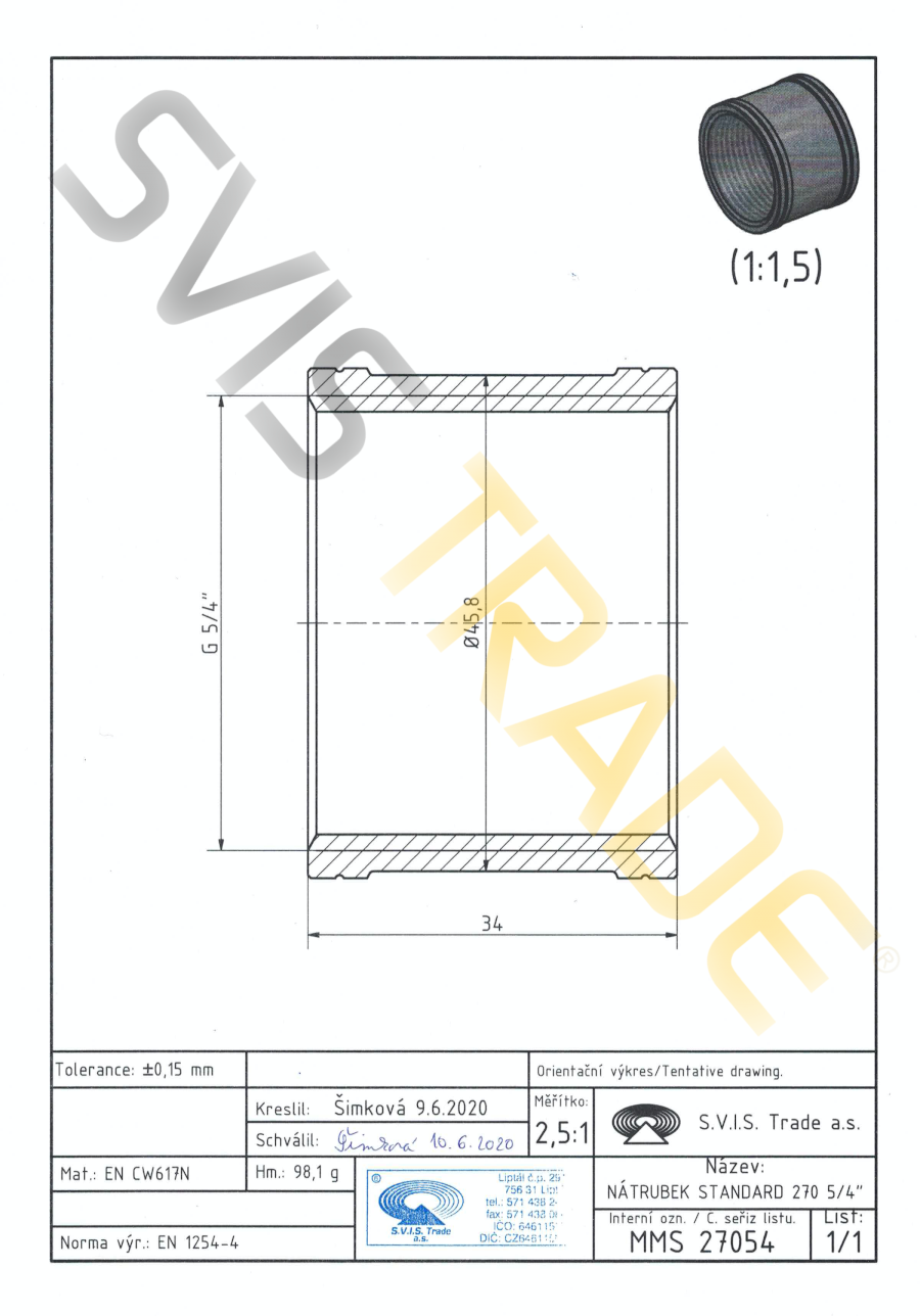 Menetes sárgaréz idom, karmantyú belső-belső csőmenettel, felületi kezelés nélkül. Hengeres G menettel, ahol a tömítés nem a menetben van - ISO 228-1 norma szerint. Gyártása az EN 1254-4 szerint történik. S.V.I.S. Trade Kft. - menetes idomok Csehországi gyártója , az ISO 9001, ISO 14001, OHSAS 18001 tanúsítványok tulajdonosa. A sárgaréz idomok meghibásodása okozta károkra, biztosítás van érvényben az egész EU területén. A fittingek felhasználhatóak levegő, víz, ivóvíz , nem abrazív és nem agresszív anyagokat tartalmazó rendszerekhez, 1,6MP nyomás értékig és -20°C tól 120°C feltételek mellett , miközben biztosított az anyagok fagyállósága. A STANDARD minőségben előállitott fittingek magasabb követelményeknek felelnek meg a menetek szempontjából. A sárgaréz idomok a CW617N minőségi réz anyagból vannak előállitva. A gyártó a fittingek tömítéséhez tefloncsík illetve teflon tömítőzsinór használatát javasolja. A gyártó NEM AJÁNLJA a kenderből készült tömítések használatát sárgaréz fittingjeihez. A gyártó ajánlata felhasználáshoz, szereléshez: víz és ivóvíz rendszerekhez, központi fűtéshez, levegő fűtéses rendszerekhez.