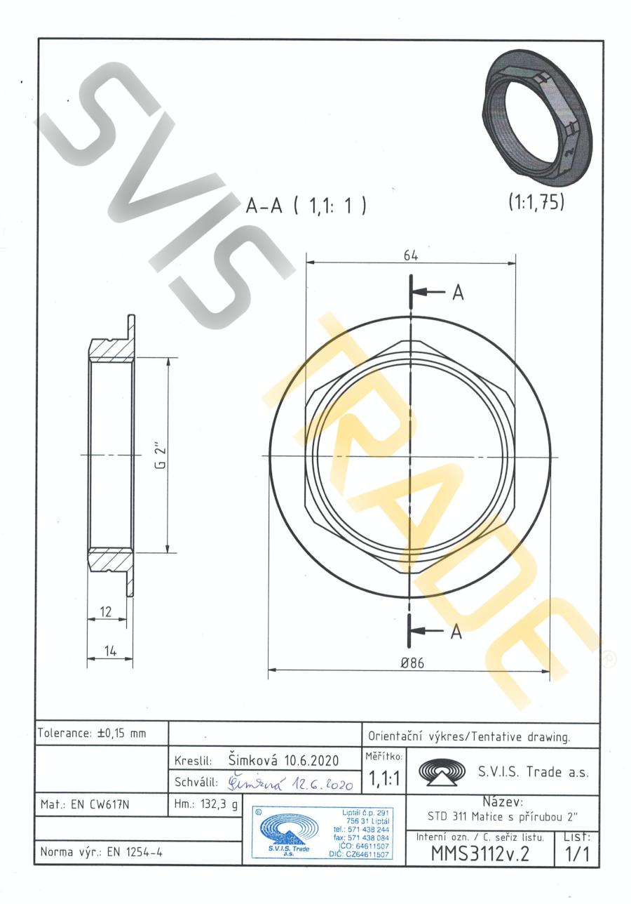 Mosazná matice s přírubou MM – 311 MMS - STANDARD. Vyrobeno dle EN 1254-4 závitová mosazná tvarovka – matice mosazná s přírubou s trubkovým válcovým závitem G vnitřním dle ISO 228-1. Bez povrchové úpravy.