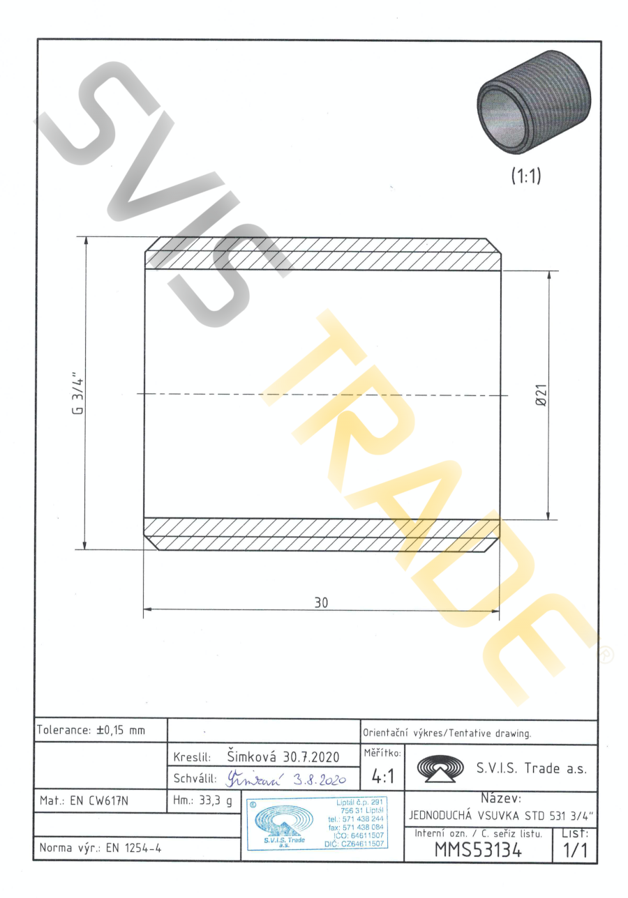 Mosiężny nypel pełny MM - 531 MMS-STANDARD. Wyprodukowana według normy EN 1254-4 - gwintowana mosiężna złączka. Bez obróbki powierzchniowej. S.V.I.S Trade-czeski producent kształtek jest posiadaczem certyfikatów ISO 9001,ISO 14001,OHSAS 18001. Na mosiężne kształtki stosujemy ubezpieczenie szkody na całym terytorium EU. Zaprojektowane do dystrybucji wody,wody pitnej,powietrza,nieabrazyjne i nie agresywne media do dopuszczalnego ciśnienia 1,6 MPa i temperatury od -20°C do 120 °C, z koniecznością uniknięcia zamrożenia mediów. Seria kształtek STANDARD-spełnia wyższe wymagania dla połączeń gwintowanych. Mosiężne kształtki są produkowane z mosiądzu CW617 N. Jako materiał uszczelniający do montażu złączek mosiężnych zaleca się uzywanie taśmy teflonowej lub przewodu teflonowego. Producent NIE ZALECA używania konopi jako materiał uszczelniający. Zalecenia dla instalacji: dystrybucja wody,dystrybucja wody pitnej,dystrybucja ciepła,powietrza.