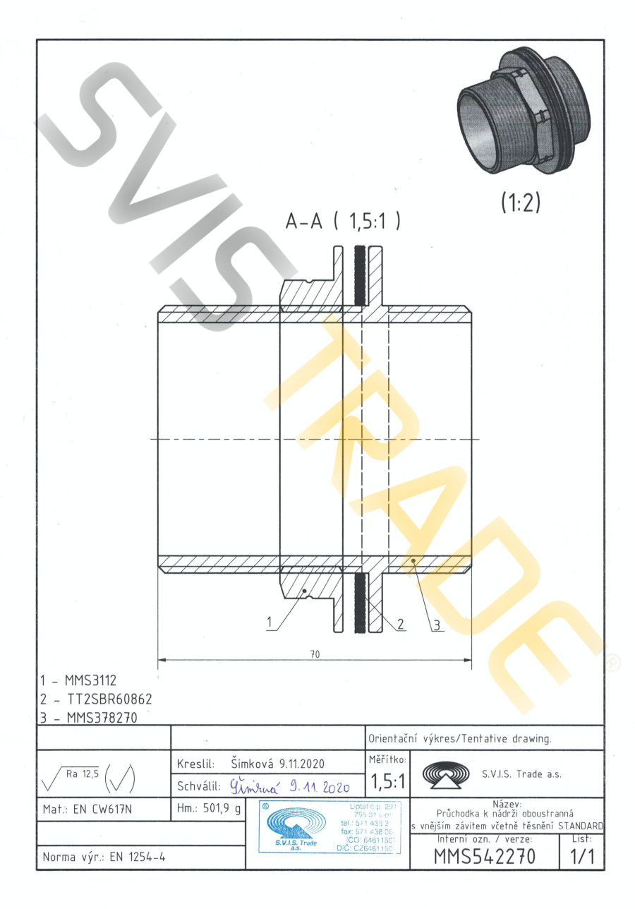 Mosazná průchodka k nádrži oboustranná s pryžovým těsněním M – 542 MMS - STANDARD. Vyrobeno dle EN 1254-4 závitová mosazná tvarovka – mosazná průchodka nádrží s opěrným kroužkem a vnějšími trubkovými válcovými závity G dle ISO 228-1. Průchodka vytváří přechod přes stěnu nádrže s možností napojení na kohout, vypouštěcí / napouštěcí ventil nebo sání čerpadla a pod.. Bez povrchové úpravy.