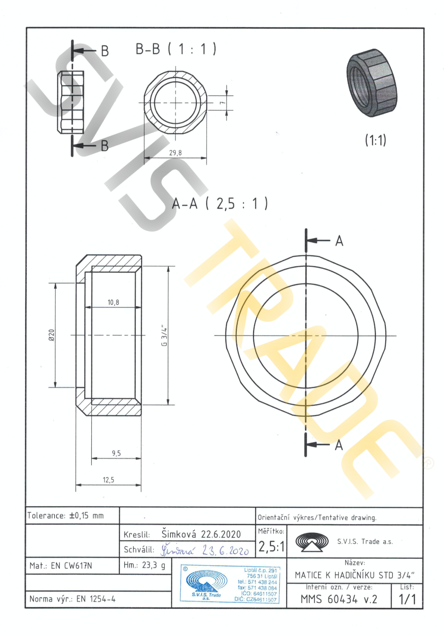 Mosiężna okrągła nakrętka F - 604 MMS-STANDARD. Wyprodukowana według normy EN 1254-4 - gwintowana mosiężna złączka. Bez obróbki powierzchniowej. S.V.I.S Trade-czeski producent kształtek jest posiadaczem certyfikatów ISO 9001,ISO 14001,OHSAS 18001. Na mosiężne kształtki stosujemy ubezpieczenie szkody na całym terytorium EU. Zaprojektowane do dystrybucji wody,wody pitnej,powietrza,nieabrazyjne i nie agresywne media do dopuszczalnego ciśnienia 1,6 MPa i temperatury od -20°C do 120 °C, z koniecznością uniknięcia zamrożenia mediów. Seria kształtek STANDARD-spełnia wyższe wymagania dla połączeń gwintowanych. Mosiężne kształtki są produkowane z mosiądzu CW617 N. Jako materiał uszczelniający do montażu złączek mosiężnych zaleca się uzywanie taśmy teflonowej lub przewodu teflonowego. Producent NIE ZALECA używania konopi jako materiał uszczelniający. Zalecenia dla instalacji: dystrybucja wody,dystrybucja wody pitnej,dystrybucja ciepła,powietrza.