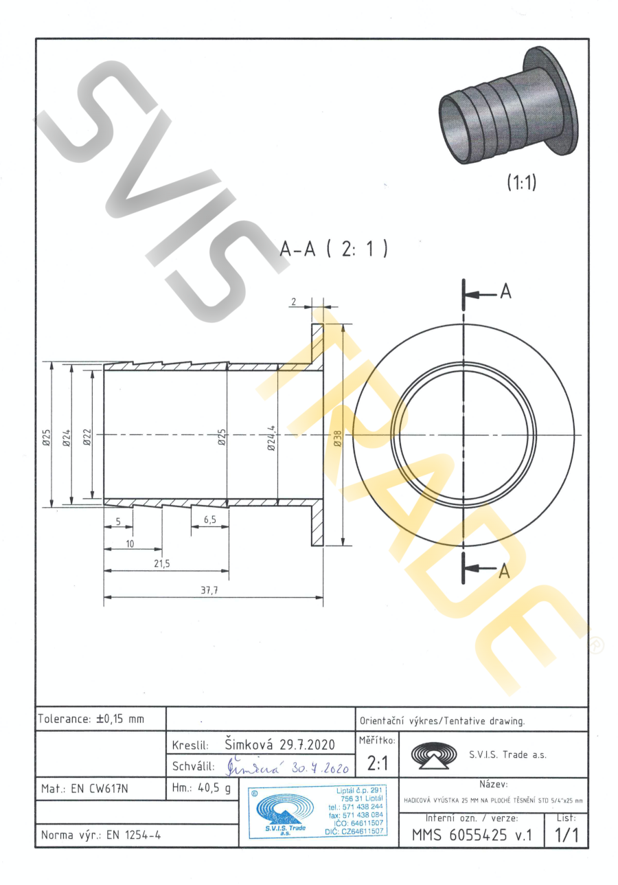 Mosiężne złącze do węża z uszczelnieniem płaskim - 605 MMS-STANDARD. Wyprodukowana według normy EN 1254-4 - gwintowana mosiężna złączka. Bez obróbki powierzchniowej. S.V.I.S Trade-czeski producent kształtek jest posiadaczem certyfikatów ISO 9001,ISO 14001,OHSAS 18001. Na mosiężne kształtki stosujemy ubezpieczenie szkody na całym terytorium EU. Zaprojektowane do dystrybucji wody,wody pitnej,powietrza,nieabrazyjne i nie agresywne media do dopuszczalnego ciśnienia 1,6 MPa i temperatury od -20°C do 120 °C, z koniecznością uniknięcia zamrożenia mediów. Seria kształtek STANDARD-spełnia wyższe wymagania dla połączeń gwintowanych. Mosiężne kształtki są produkowane z mosiądzu CW617 N. Jako materiał uszczelniający do montażu złączek mosiężnych zaleca się uzywanie taśmy teflonowej lub przewodu teflonowego. Producent NIE ZALECA używania konopi jako materiał uszczelniający. Zalecenia dla instalacji: dystrybucja wody,dystrybucja wody pitnej,dystrybucja ciepła,powietrza.