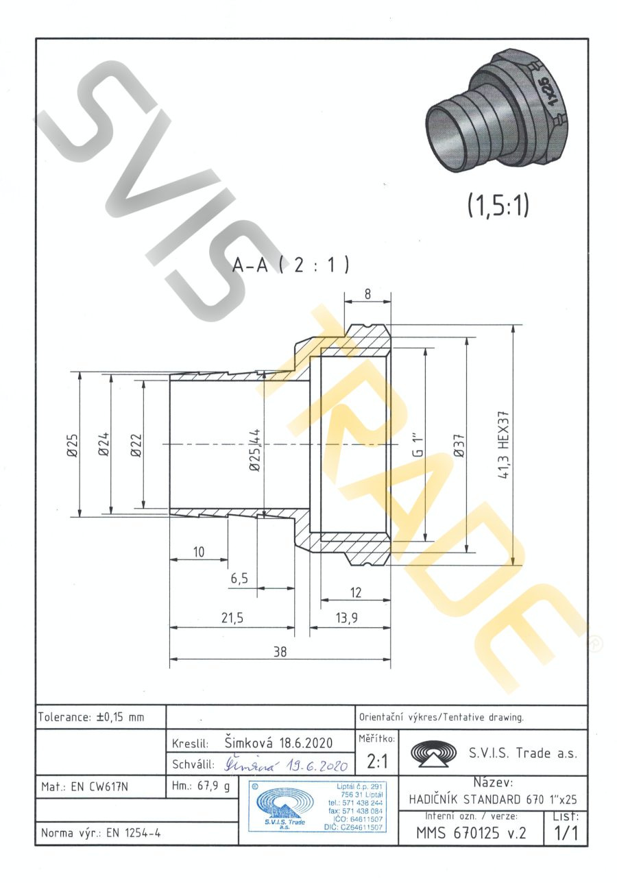 Mosiężna złączka do węża F - 670 MMS-STANDARD. Wyprodukowana według normy EN 1254-4 - gwintowana mosiężna złączka. Bez obróbki powierzchniowej. S.V.I.S Trade-czeski producent kształtek jest posiadaczem certyfikatów ISO 9001,ISO 14001,OHSAS 18001. Na mosiężne kształtki stosujemy ubezpieczenie szkody na całym terytorium EU. Zaprojektowane do dystrybucji wody,wody pitnej,powietrza,nieabrazyjne i nie agresywne media do dopuszczalnego ciśnienia 1,6 MPa i temperatury od -20°C do 120 °C, z koniecznością uniknięcia zamrożenia mediów. Seria kształtek STANDARD-spełnia wyższe wymagania dla połączeń gwintowanych. Mosiężne kształtki są produkowane z mosiądzu CW617 N. Jako materiał uszczelniający do montażu złączek mosiężnych zaleca się uzywanie taśmy teflonowej lub przewodu teflonowego. Producent NIE ZALECA używania konopi jako materiał uszczelniający. Zalecenia dla instalacji: dystrybucja wody,dystrybucja wody pitnej,dystrybucja ciepła,powietrza.