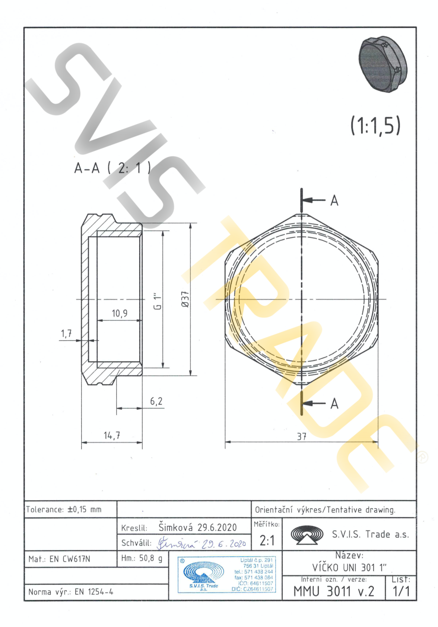 Mosiężna zaślepka F - 301 MMU-UNIVERSAL. Wyprodukowana według normy EN 1254-4 - gwintowana mosiężna złączka. Bez obróbki powierzchniowej. S.V.I.S Trade-czeski producent kształtek jest posiadaczem certyfikatów ISO 9001,ISO 14001,OHSAS 18001. Na mosiężne kształtki stosujemy ubezpieczenie szkody na całym terytorium EU. Zaprojektowane do dystrybucji wody,wody pitnej,powietrza,nieabrazyjne i nie agresywne media do dopuszczalnego ciśnienia 1,6 MPa i temperatury od -20°C do 120 °C, z koniecznością uniknięcia zamrożenia mediów. Seria kształtek UNIVESRAL - spełniają standardowe wymagania dotyczące połączeń gwintowych Mosiężne kształtki są produkowane z mosiądzu CW617 N. Jako materiał uszczelniający do montażu złączek mosiężnych zaleca się uzywanie taśmy teflonowej lub przewodu teflonowego. Producent NIE ZALECA używania konopi jako materiał uszczelniający. Zalecenia dla instalacji: dystrybucja wody,dystrybucja wody pitnej,dystrybucja ciepła,powietrza.