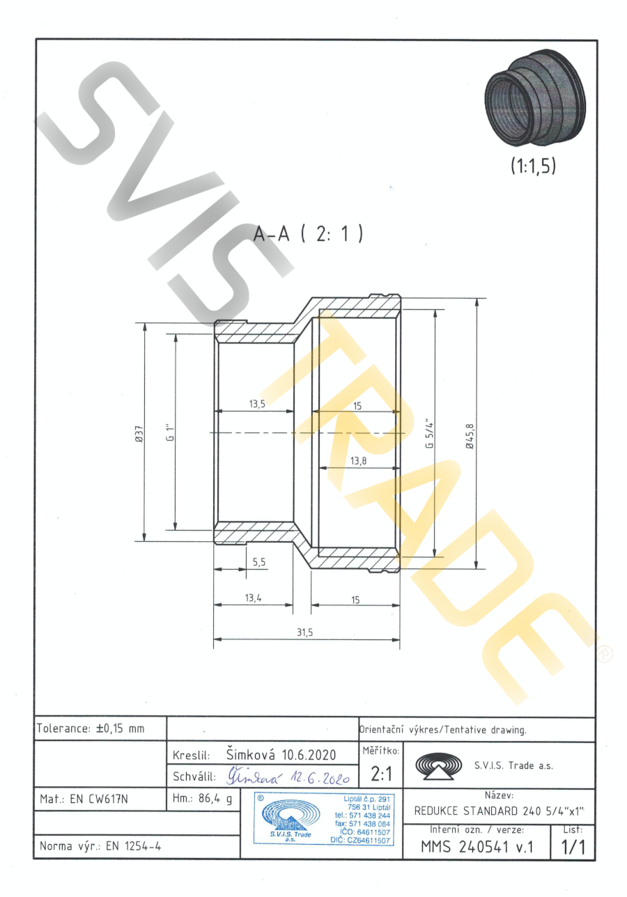 Závitová tvarovka z mosadze, druh - nátrubok s redukovaným priechodom s rúrkovými závitmi vnútorný x vnútorný, bez povrchovej úpravy. Pripojovacie závity G sú valcové pre spoje netesniace na závitoch podľa normy ISO 228-1. Vyrobené podľa normy EN 1254-4.